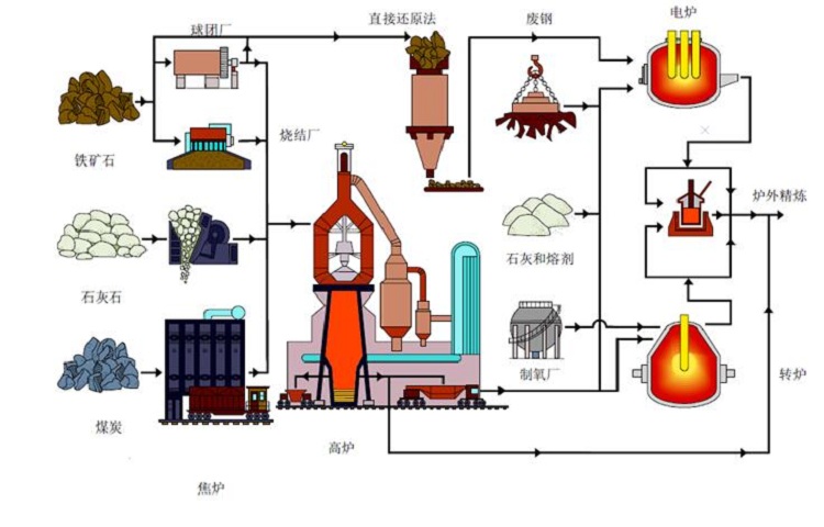 目前兩大主要鋼鐵生產(chǎn)工藝:長(zhǎng)流程生產(chǎn)工藝以高爐和堿性氧氣轉(zhuǎn)爐為主,它們所用的原料包括鐵礦石、煤炭、石灰石和回收的廢鋼。該工藝生產(chǎn)一噸粗鋼平均使用1.4噸鐵礦石、0.8噸煤、0.3噸石灰石以及0.12噸廢鋼。電弧爐生產(chǎn)工藝主要使用回收的廢鋼及直接還原鐵和電。電弧爐工藝生產(chǎn)一噸粗鋼平均使用0.88噸廢鋼、16千克煤以及64千克石灰石。