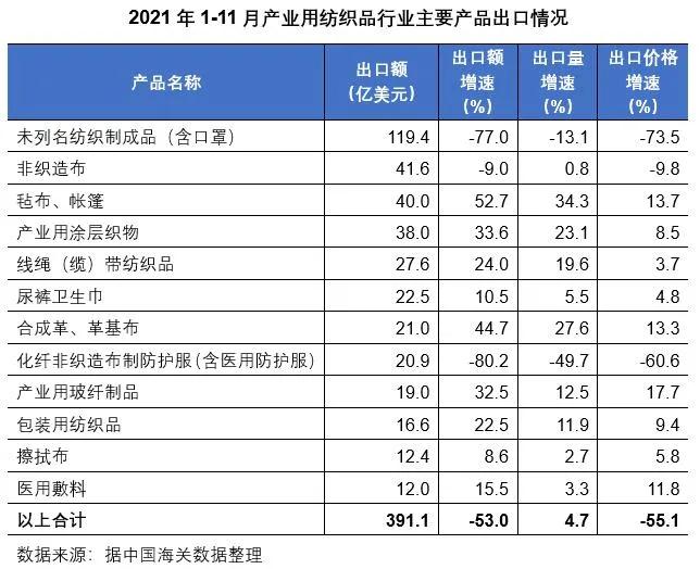 國(guó)際貿(mào)易方面,根據(jù)中國(guó)海關(guān)數(shù)據(jù),2021年1-11月我國(guó)產(chǎn)業(yè)用紡織品主要出口產(chǎn)品(按出口金額排名前十二類產(chǎn)品)的出口額為391.1億美元,同比下降53.0%。分產(chǎn)品來(lái)看,未列名紡織制成品(主要為口罩)目前是行業(yè)最大的出口產(chǎn)品,但因國(guó)外對(duì)口罩需求的大幅回落其出口額已較上年同期下降了77.0%,出口均價(jià)同比下降73.5%;氈布/帳篷、產(chǎn)業(yè)用涂層織物等傳統(tǒng)產(chǎn)品的出口額分別同比增長(zhǎng)52.7%和33.6%,出口均價(jià)分別同比增長(zhǎng)13.7%和8.5%;合成革及革基布的出口額同比增長(zhǎng)44.7%,出口均價(jià)同比增長(zhǎng)13.3%。非織造布及相關(guān)制品的出口呈現(xiàn)不同走勢(shì),卷材出口41.6億美元,同比下降9.0%,出口量126.0萬(wàn)噸,同比小幅上漲0.8%,出口均價(jià)同比下滑9.8%;化纖非織造布制防護(hù)服(含醫(yī)用防護(hù)服)出口20.9億美元,同比下降80.2%,出口均價(jià)同比大幅下降60.6%;一次性衛(wèi)生用品出口22.5億美元,同比增長(zhǎng)10.5%,出口均價(jià)同比增長(zhǎng)4.8%。從整體看,價(jià)格是影響我國(guó)產(chǎn)業(yè)用紡織品出口增速的主要因素。