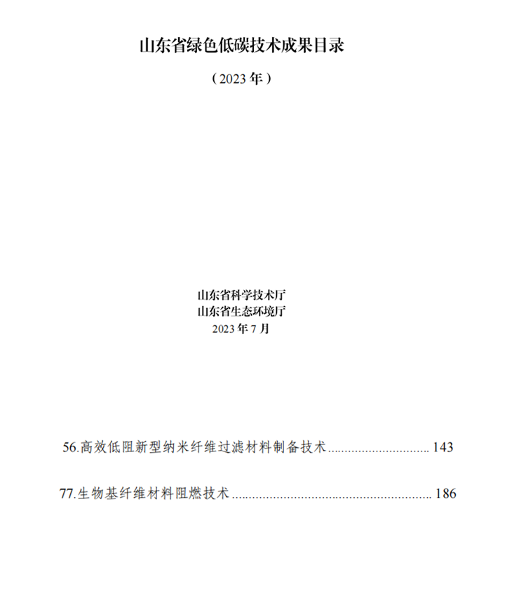 山東省科技廳和山東省生態環境廳聯合發布《關于發布<2023年山東省綠色低碳技術成果目錄>的通知》,山東奧博環保科技有限公司的2項技術成果《高效低阻新型納米纖維過濾材料制備技術》、《生物基纖維材料阻燃技術》,成功入選該目錄!為助力可持續發展,具有重要意義!