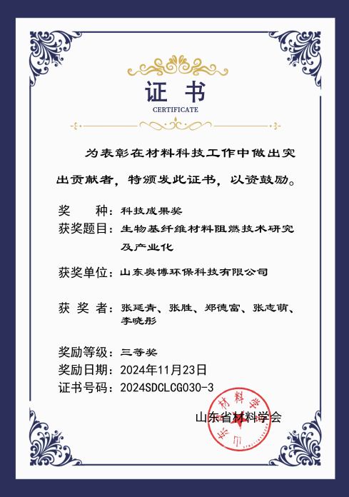 山東奧博環保的科研課題《生物基纖維材料阻燃技術研究及產業化》,榮獲此次山東省科技成果三等獎!