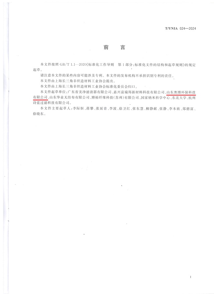 作為國內功能性新材料領域的領先企業,山東奧博環保科技有限公司參與團體標準T/YNIA 024-2024《抗靜電、阻燃納米纖維復合濾材》的起草與制定工作,標志著山東奧博環保在技術創新與行業規范建設方面取得雙重突破。
